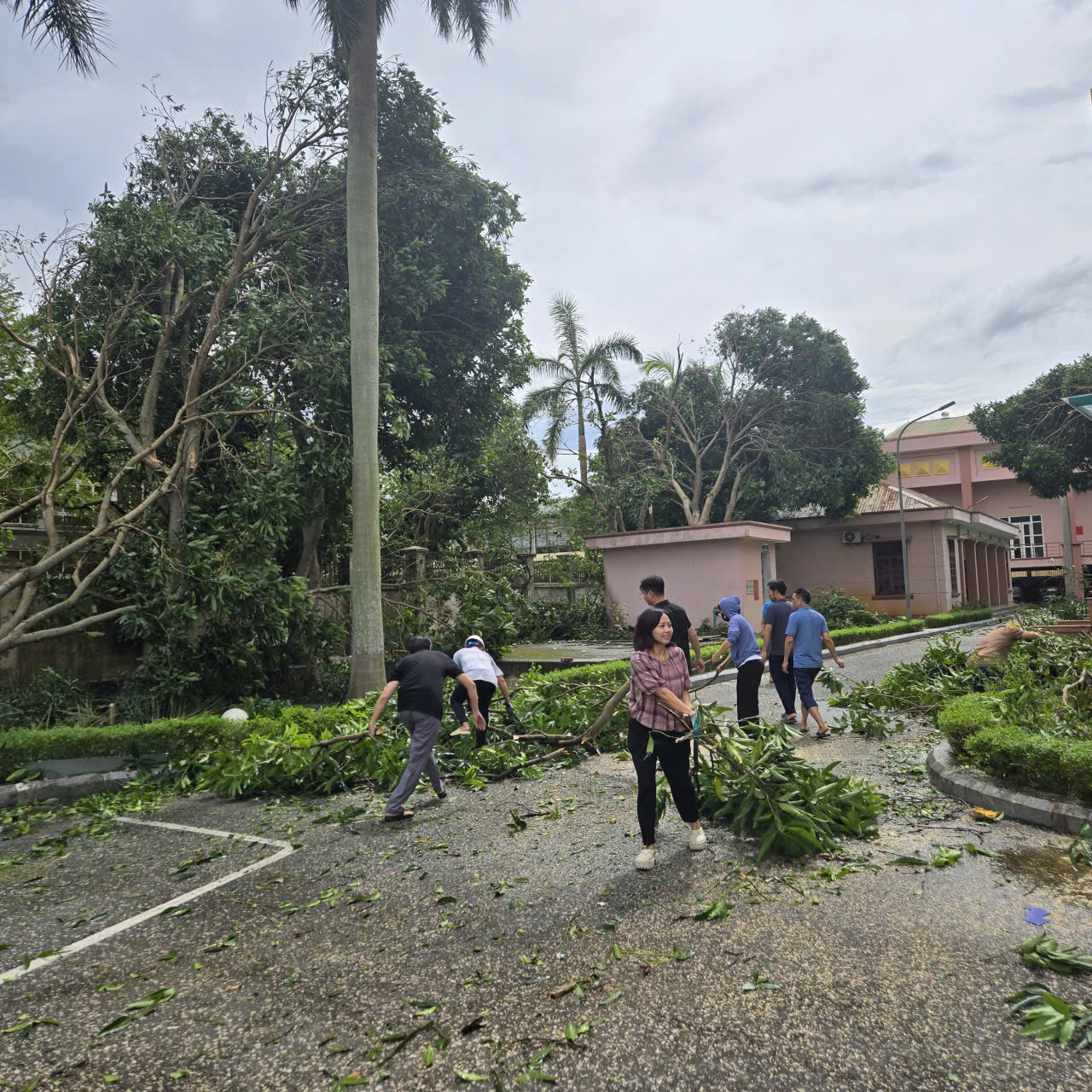 Dù đã chủ động ứng phó, nhưng những cơn gió mạnh cùng mưa lớn vẫn khiến nhiều cây xanh bật gốc, đổ chắn lối đi, nhiều cửa kính bị vỡ, làm ảnh hưởng đến cảnh quan và hoạt động của công ty. Ngay sau khi bão tan, toàn thể cán bộ, công nhân viên (CBCNV) Công ty Thủy điện Bản Vẽ đã không ngại khó khăn, nhanh chóng bắt tay vào công tác dọn dẹp, khắc phục hậu quả. Dưới sự chỉ đạo của Ban lãnh đạo Công ty, các đội nhóm được phân công cụ thể. Người chặt tỉa cành cây gãy, người gom dọn lá rụng, người cưa những thân cây lớn chắn ngang đường.