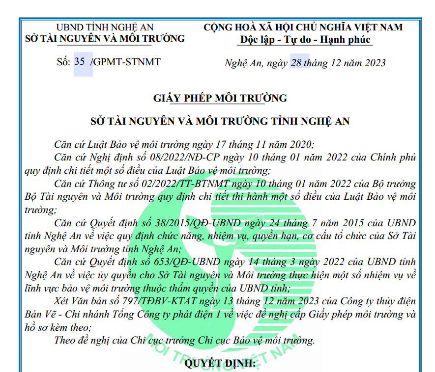Giấy phép môi trường của Sở tài Nguyên và Môi trường tỉnh Nghệ An cấp cho Công ty Thủy điện Bản Vẽ
