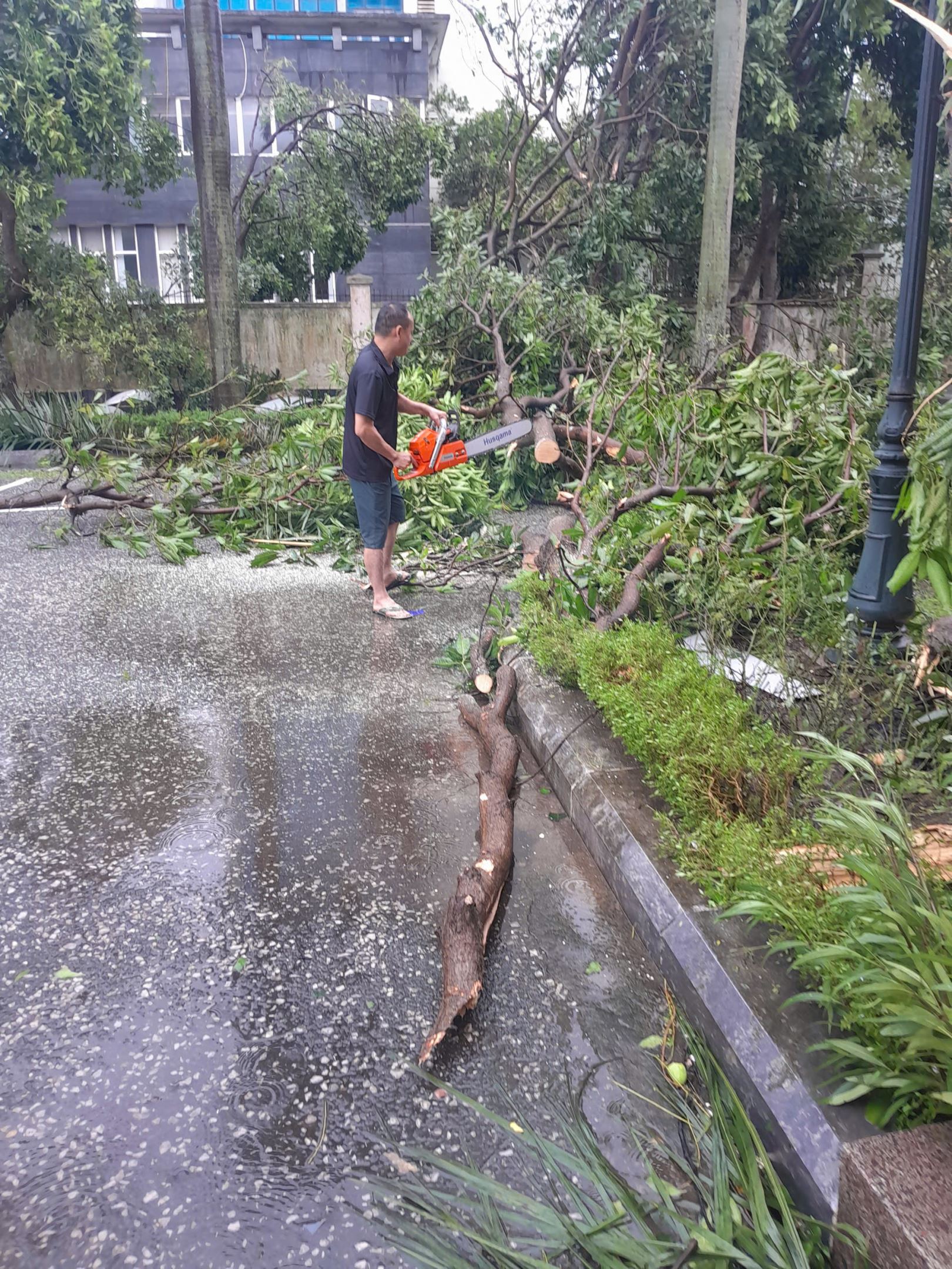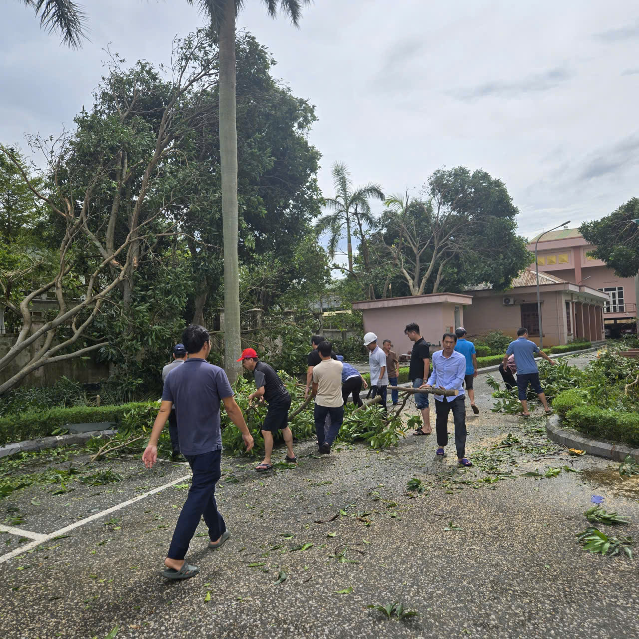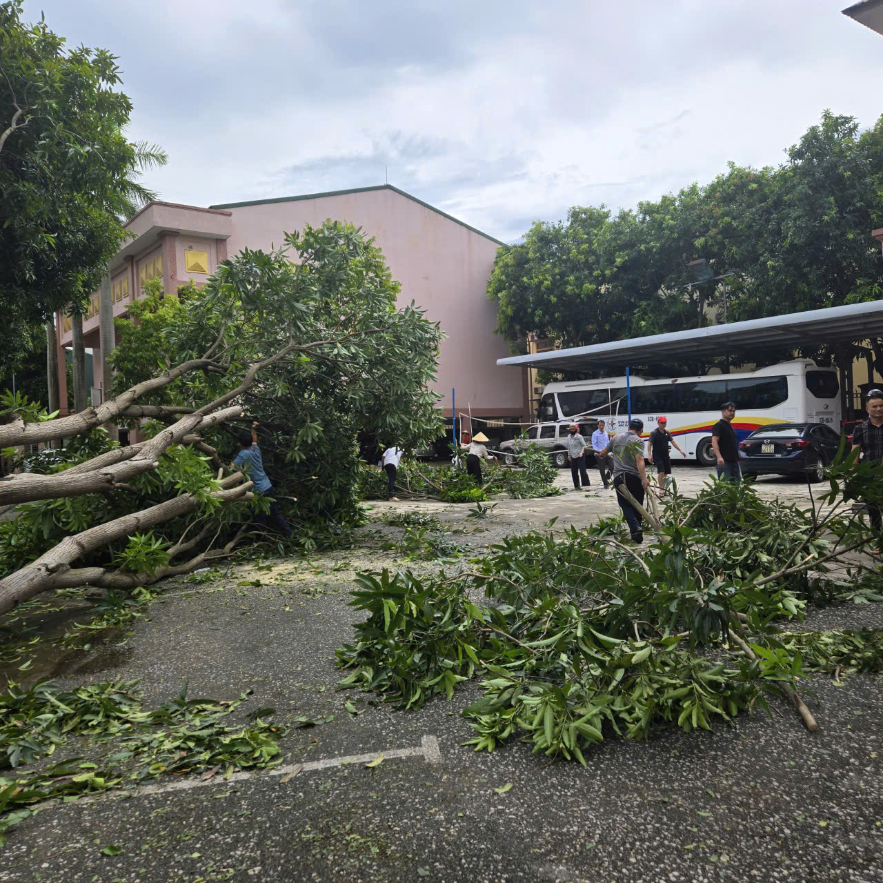 Dù đã chủ động ứng phó, nhưng những cơn gió mạnh cùng mưa lớn vẫn khiến nhiều cây xanh bật gốc, đổ chắn lối đi, nhiều cửa kính bị vỡ, làm ảnh hưởng đến cảnh quan và hoạt động của công ty. Ngay sau khi bão tan, toàn thể cán bộ, công nhân viên (CBCNV) Công ty Thủy điện Bản Vẽ đã không ngại khó khăn, nhanh chóng bắt tay vào công tác dọn dẹp, khắc phục hậu quả. Dưới sự chỉ đạo của Ban lãnh đạo Công ty, các đội nhóm được phân công cụ thể. Người chặt tỉa cành cây gãy, người gom dọn lá rụng, người cưa những thân cây lớn chắn ngang đường.