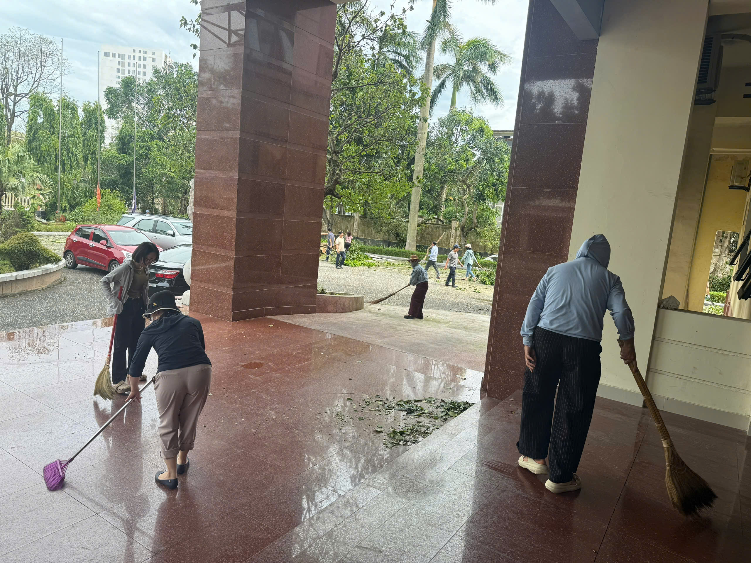 Từng nhóm CBCNV cẩn thận thu dọn mảnh kính vỡ, thay thế những tấm kính mới để đảm bảo an toàn. Tiếng cưa máy, tiếng chổi quét, tiếng gọi nhau cùng làm việc hòa vào nhau, tạo nên một không khí lao động khẩn trương, hăng say. Hình ảnh CBCNV mồ hôi nhễ nhại, cùng nhau di chuyển những cành cây lớn, hay tỉ mỉ dọn dẹp từng ngóc ngách đã thể hiện tinh thần đoàn kết, ý thức trách nhiệm cao cả. Họ không chỉ làm việc bằng sức lực mà còn bằng cả tấm lòng, mong muốn nhanh chóng đưa mọi hoạt động trở lại bình thường.