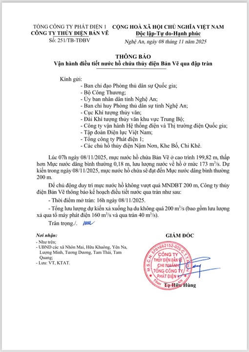 CTTĐ Bản Vẽ thông báo: Đập thuỷ điện Bản Vẽ vận hành điều tiết nước qua tràn lúc 16h00 ngày 08/11/2025. Tổng lưu lượng xả xuống hạ du không quá 200m3/s.